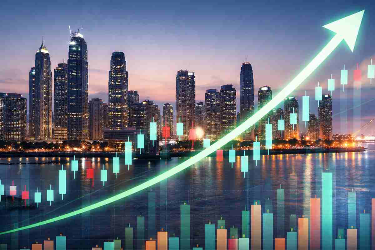 Indian stock market concept showing financial district skyline with rising chart